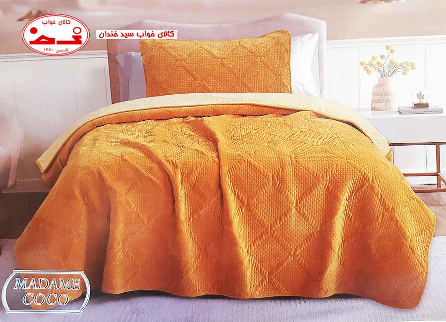 روتختی یک نفره پنبه دوزی مادام کوکو نارنجی ، که از ترکیب پارچه مخمل، لایه میانی پرشده از الیاف پنبهای و آستر نرم تشکیل شده است. که با دوختهای منظم و طرحدار، این لایهها به یکدیگر دوخته شده اند تا ظاهری برجسته و مقاوم به خود بگیرند.این دوختها علاوه بر زیبایی، از جابهجایی یا جمع شدن الیاف داخلی جلوگیری میکنند و دوام محصول را افزایش میدهند. و حتی پس از شست وشوهای مکرر فرم اولیه خود را حفظ می کنند.